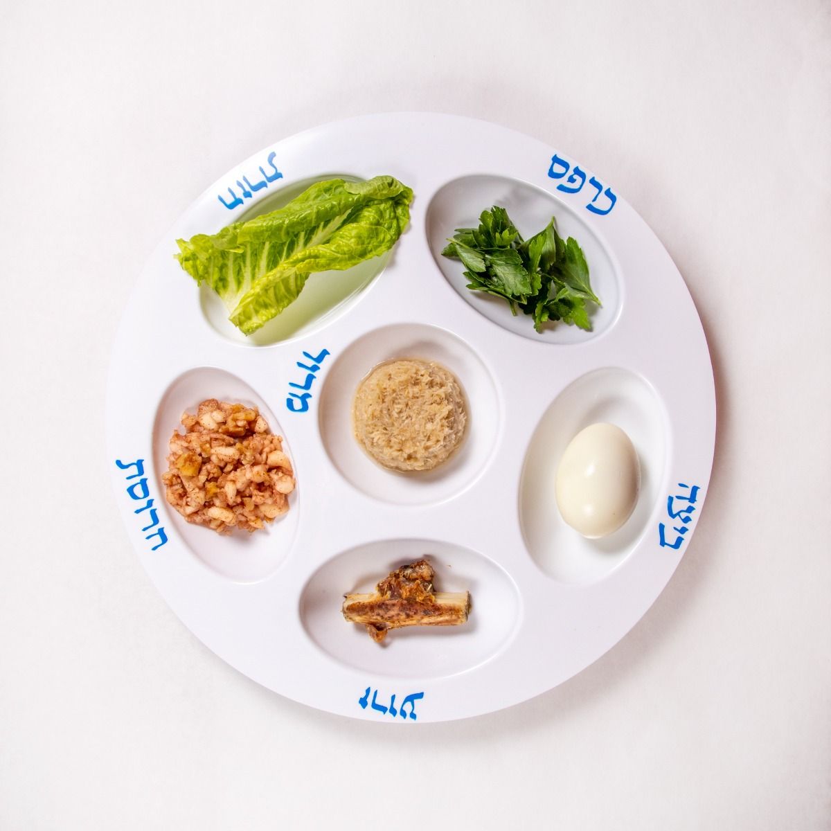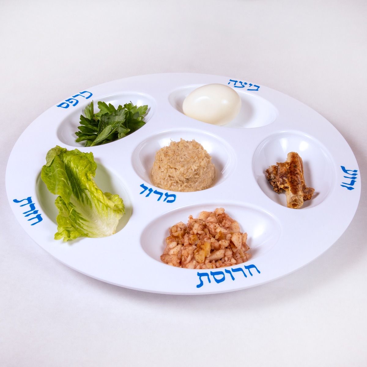 Includes all 6 items: zeroa, beitzah, maror, karpas, charoset, and hazeret.